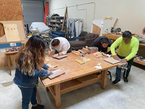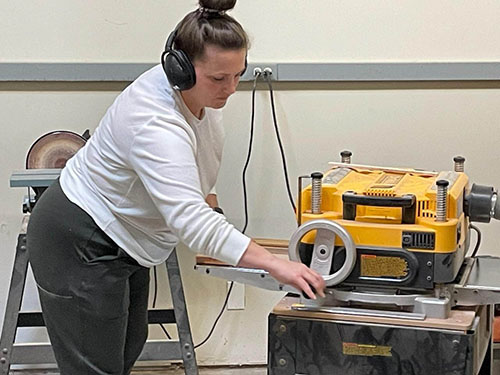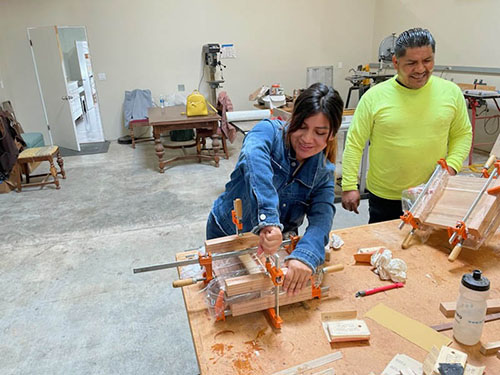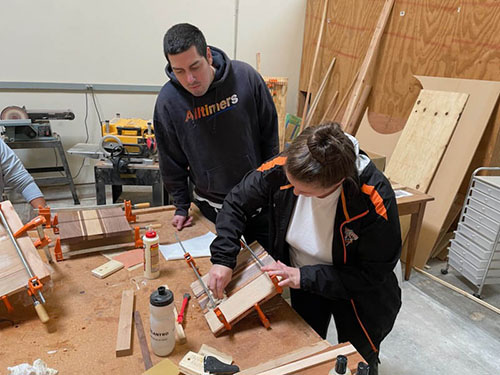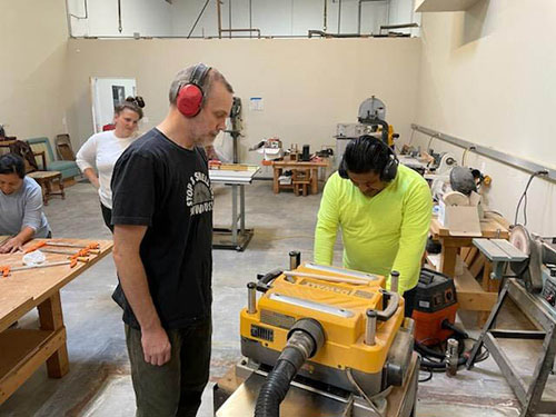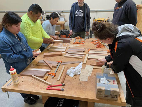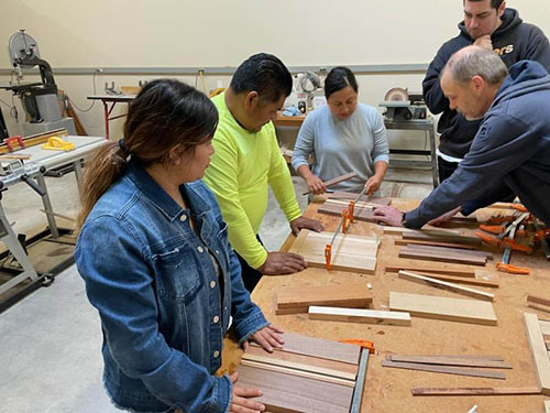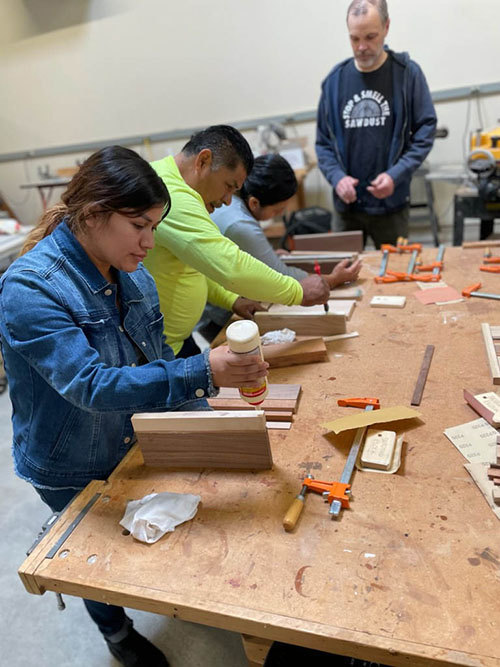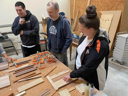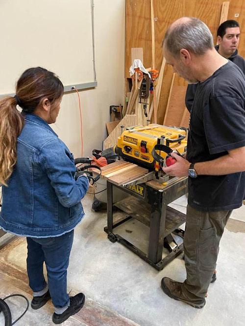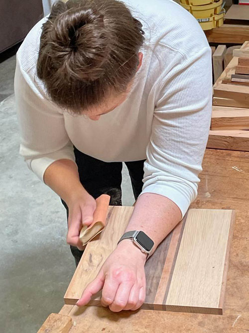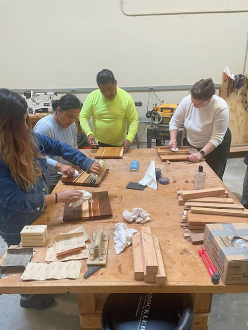 ¿Has trabajado alguna vez en una carpintería? ¡Estos padres de Beechwood se reunieron para aprender a hacer hermosas tablas de cortar de madera para su cocina! Primero, eligieron las piezas de madera que querían en su tabla de cortar y las organizaron de forma atractiva. Pegaron las tiras, las sujetaron y esperaron unos 30 minutos. Luego aprendieron a pasar sus tablas rugosas y desiguales por una cepilladora para que todo quede parejo. Siguiente paso: lijar a mano con tres granos diferentes de papel de lija, comenzando con el más grueso, luego el de grano medio y luego el muy fino, para que quede agradable y suave. El último paso fue aplicar aceite para bloques de carnicero, un protector natural para las superficies de madera que entran en contacto con los alimentos, lo que realmente resaltó la belleza natural de la madera. ¡Buen trabajo!