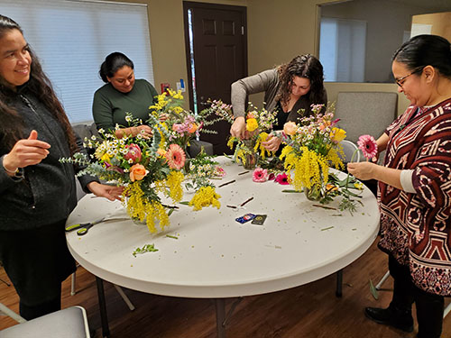 Mia Boukaka, madre de Beechwood, impartió una clase sobre los conceptos básicos de arreglos florales. Aprendimos a construir un arreglo de jarrón abstracto usando flores compradas en la tienda. Cada madre se llevó a casa su hermosa obra de arte para exhibirla como pieza central de su hogar.